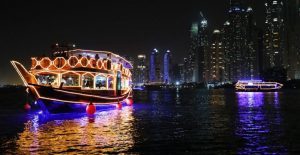 The Dubai Creek feels enchanting at night as you sail through the quiet dark waters with a backdrop of the cityscape. The dhow cruise incorporates fabulous dinner with live music and other entertainment. Not only that the boat is tastefully decorated with lights to match your romantic mood.